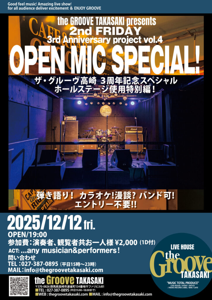 LIVE the Groove TAKASAKI 3rd Anniversary Project VOL.4 OPEN MIC SPECIAL!! “ホールステージ使用特別編” 弾き語り!カラオケ!漫談? バンド可! エントリー不要! Tweet Share Hatena Pocket RSS feedly Pin it LIVE the Groove TAKASAKI 3rd Anniversary Proj…前の記事 the Groove TAKASAKI 3rd Anniversary Proj…次の記事