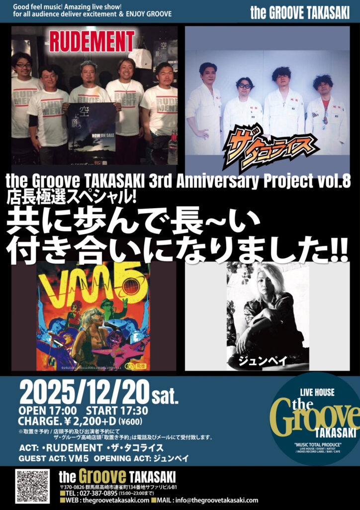 LIVE the Groove TAKASAKI 3rd Anniversary project voi.8 店長極選スペシャル! 共に歩んで長い付き合いになりました! RUDEMENT / ザ・タコライス /guest act VM5 /opening act ジュンペイ Tweet Share Hatena Pocket RSS feedly Pin it LIVE the Groove TAKASAKI 3rd Anniversary proj…前の記事 the Groove TAKASAKI 3rd Anniversary proj…次の記事