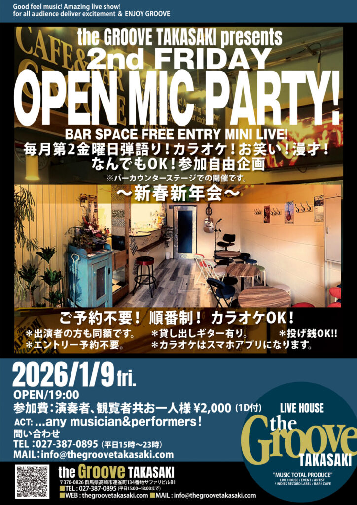 LIVE OPEN MIC PARTY!〜新春新年会〜 Tweet Share Hatena Pocket RSS feedly Pin it LIVE the Groove TAKASAKI 3rd Anniversary proj…前の記事 楽屋ライブ 2026 「おはるさんバースデー‼」 2dayR…次の記事