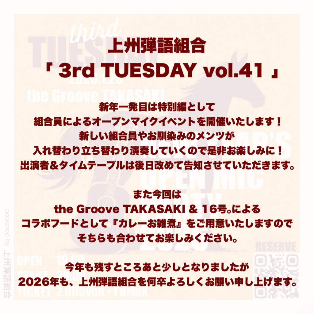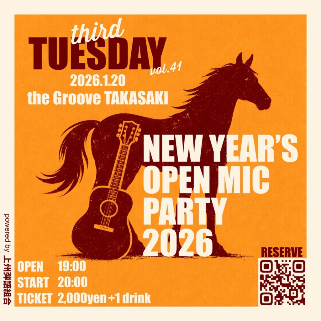LIVE 上州弾き語り組合3rd TUESDAY NEW YEAR’S OPEN MIC PARTY 2026 Screenshot Tweet Share Hatena Pocket RSS feedly Pin it LIVE BOΦWZ / NYANPLEX/ 汁 / REVERSE GARY / パプリ…前の記事 CROSSOVER VOL.38 SPECIAL ! TAKASAKI club…次の記事