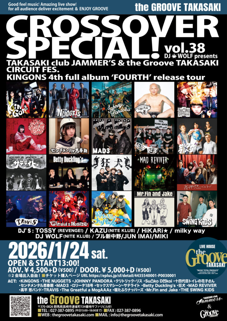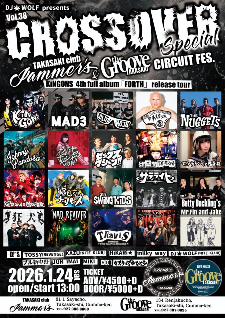 LIVE CROSSOVER VOL.38 SPECIAL ! TAKASAKI club JAMMER’S &the Groove TAKASAKI CIRCUIT FES 出演:KiNGONS / THE NUGGETS / JOHNNY PANDORA / クリトリック・リス/ Su凸ko D凹koi / 十四代目トイレの花子さん / センチメンタル思春期 / MAD3/ ロリータ18号/ セックスマシーン/ サテライト/ Betty Duckling’s / 狂犬 /MAD REVIVER / 高平 悠バンド / TRAVIS /The Greatful a MogAAAz/ 寝たふりナッパーズ / Mr.Fin and Jake/THE SWING KIDS Tweet Share Hatena Pocket RSS feedly Pin it LIVE BOΦWZ / NYANPLEX/ 汁 / REVERSE GARY / パプリ…前の記事 風の宴pre. ” Cross Road “ GUNM…次の記事