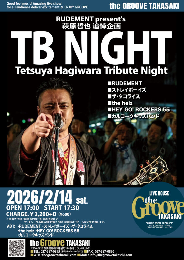 LIVE 萩原 哲也 追悼企画 ”TB NIGHT” Tetsuya Hagiwara Tribute Night 出演:RUDEMENT / ストレイボーイズ / ザ・タコライス / the heiz / HEY GO ! ROCKERS 55 / カルコークキッズバンド Tweet Share Hatena Pocket RSS feedly Pin it LIVE OPEN MIC PARTY! 2nd FRIDAY前の記事 怪人二十面奏 単独公演巡業二〇二六 「其ノ能ク歡ヲ盡セヨ、月下ノ帝國ニテ」次の記事