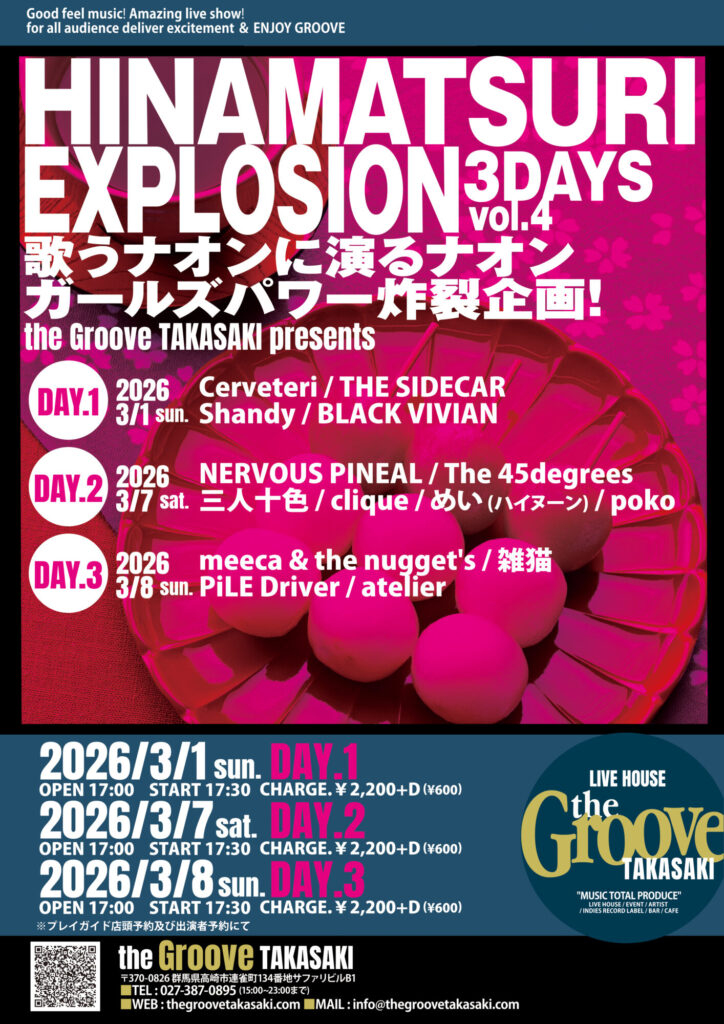 LIVE “HINAMATSURI EXPLOSION ‼ “VOL.4 DAY 2歌うナオンに演るナオン ガールズパワー炸裂企画!NERVOUS PINEAL / The 45degrees /三人十色 / clique / めい(ハイヌーン)/poko Tweet Share Hatena Pocket RSS feedly Pin it LIVE “HINAMATSURI EXPLOSION ‼ &#…前の記事 “HINAMATSURI EXPLOSION ‼ &#…次の記事