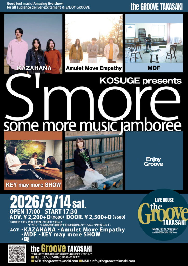 LIVE the Groove TAKASAKI KOSUGE presents “S’more” KAZAHANA / Amulet Move Empathy / MDF / KEY may more SHOW /朙 Tweet Share Hatena Pocket RSS feedly Pin it LIVE OPEN MIC PARTY ! 2nd FRIDAY前の記事 Double Side Cutter / sweetest vengeance …次の記事