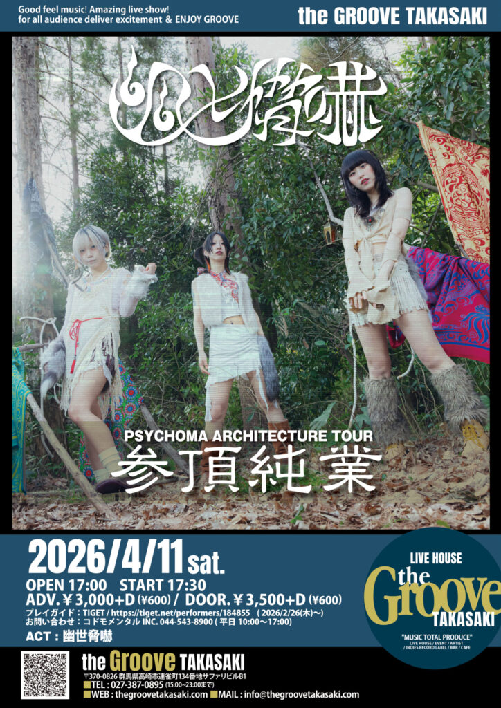 LIVE 幽世脅嚇 参頂純業 PSYCHOMA ARCHITECTURE TOUR プレイガイド:TIGET https://tiget.net/performers/184855 2026/2/26(木)〜 Tweet Share Hatena Pocket RSS feedly Pin it LIVE サイゴノシュダン /THE MONKEY HIP’S/ 水野晋太郎/…前の記事 安達久美 Live in 高崎 with えどや次の記事
