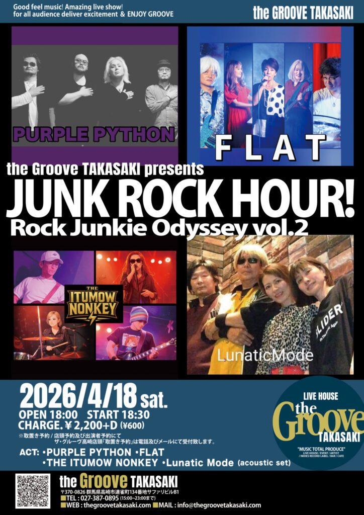 LIVE “JUNK ROCK HOUR!” Rock Junkie Odyssey vol.2 PURPLE PYTHON / FLAT / THE ITUMOW NONKEY / Lunatic Mode(acoustic set) Tweet Share Hatena Pocket RSS feedly Pin it LIVE 安達久美 Live in 高崎 with えどや前の記事 誠 香川と京介じくろの “酒のツマミになるライブ”vol…次の記事