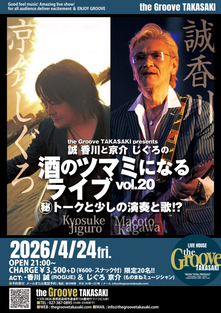 LIVE 誠 香川と京介じくろの “酒のツマミになるライブ”vol.20 マル秘トークと少しの演奏と歌!? Tweet Share Hatena Pocket RSS feedly Pin it LIVE 安達久美 Live in 高崎 with えどや前の記事 “連雀町昭和歌謡祭 MUSIC FAIR 2026” I…次の記事