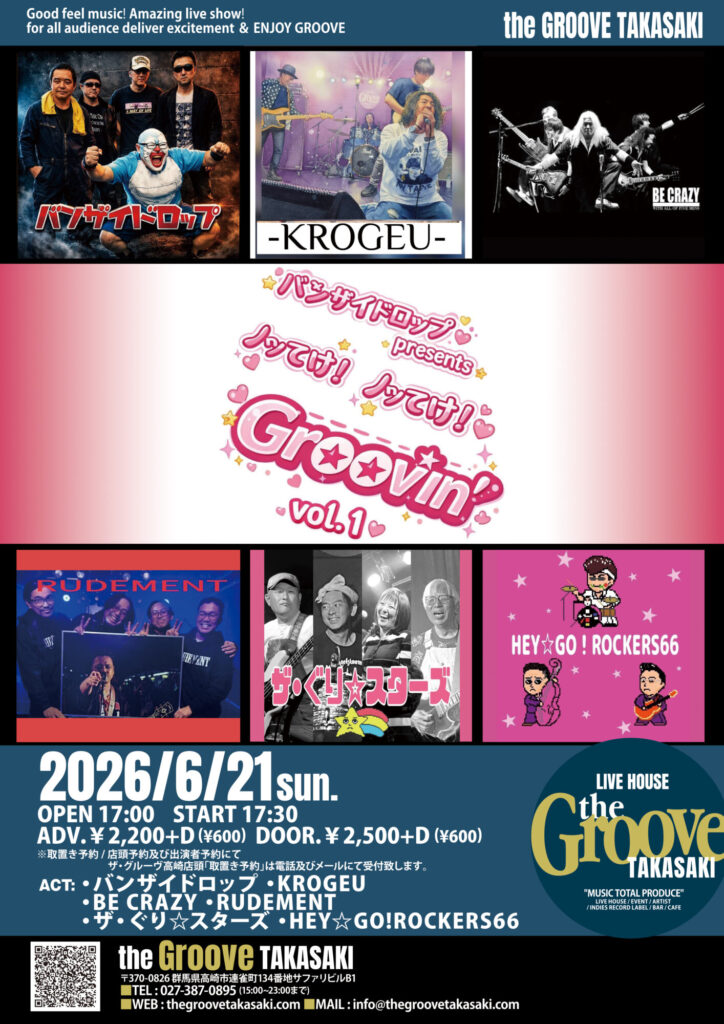 LIVE バンザイドロップ presents “ノッてけ!ノッてけ! Groovin’ vol.1 バンザイドロップ / KROGEU/ BE CRAZY /RUDEMENT / ザ・ぐり⭐スターズ / HEY⭐GO!ROCKERS6 Tweet Share Hatena Pocket RSS feedly Pin it LIVE “連雀町昭和歌謡祭 MUSIC FAIR 2026” I…前の記事 the Groove TAKASAKI 3周年のご挨拶次の記事